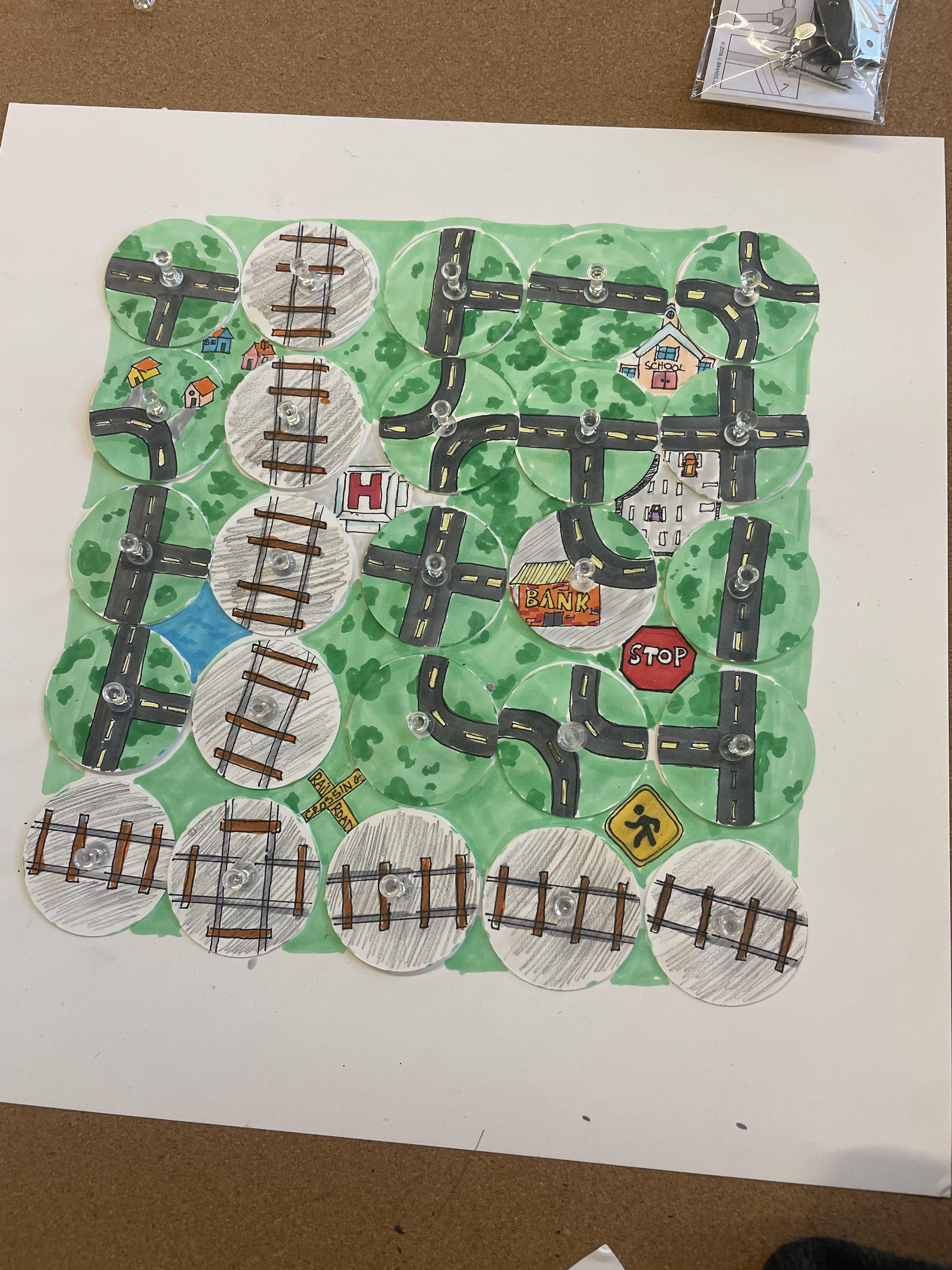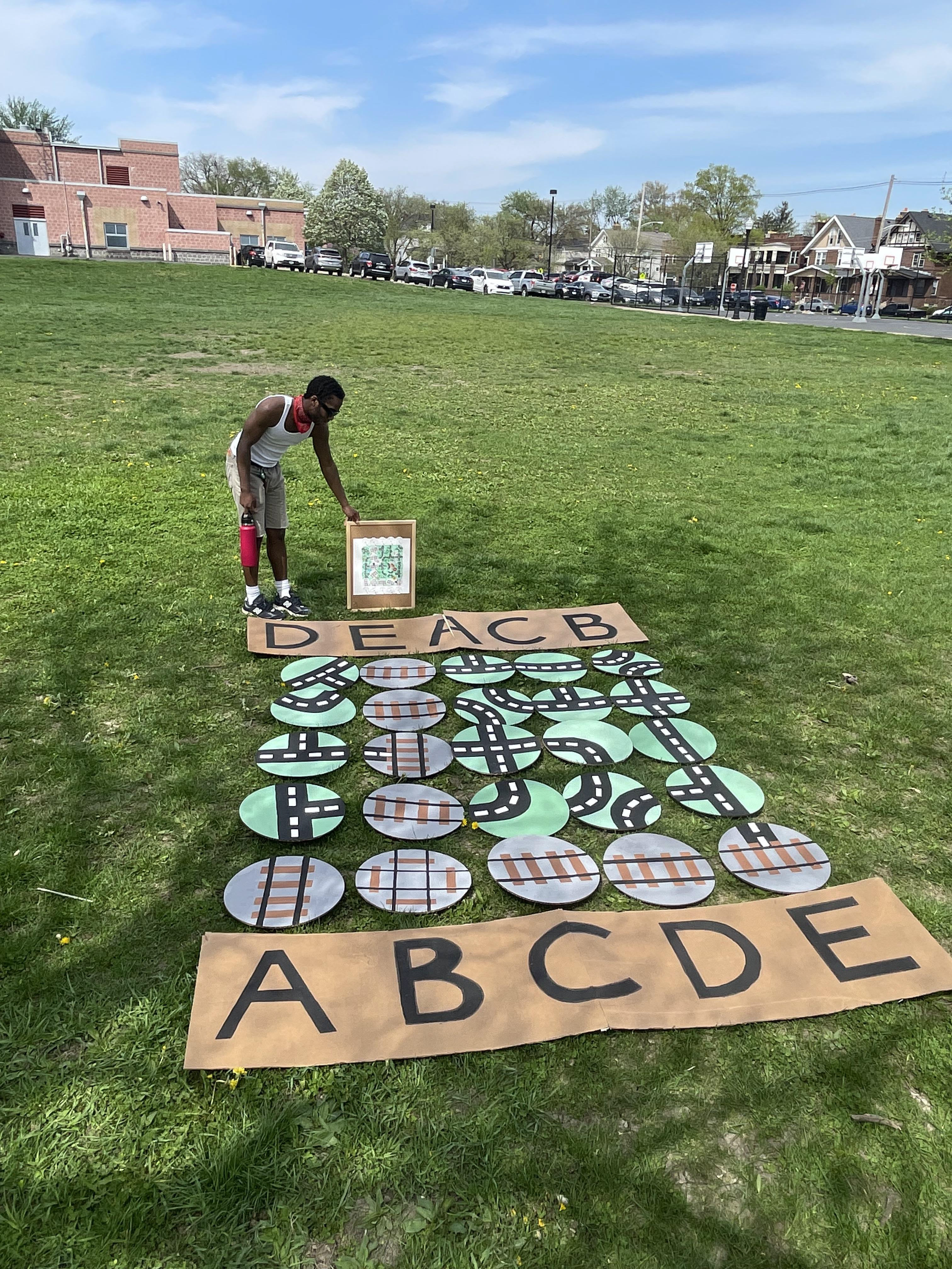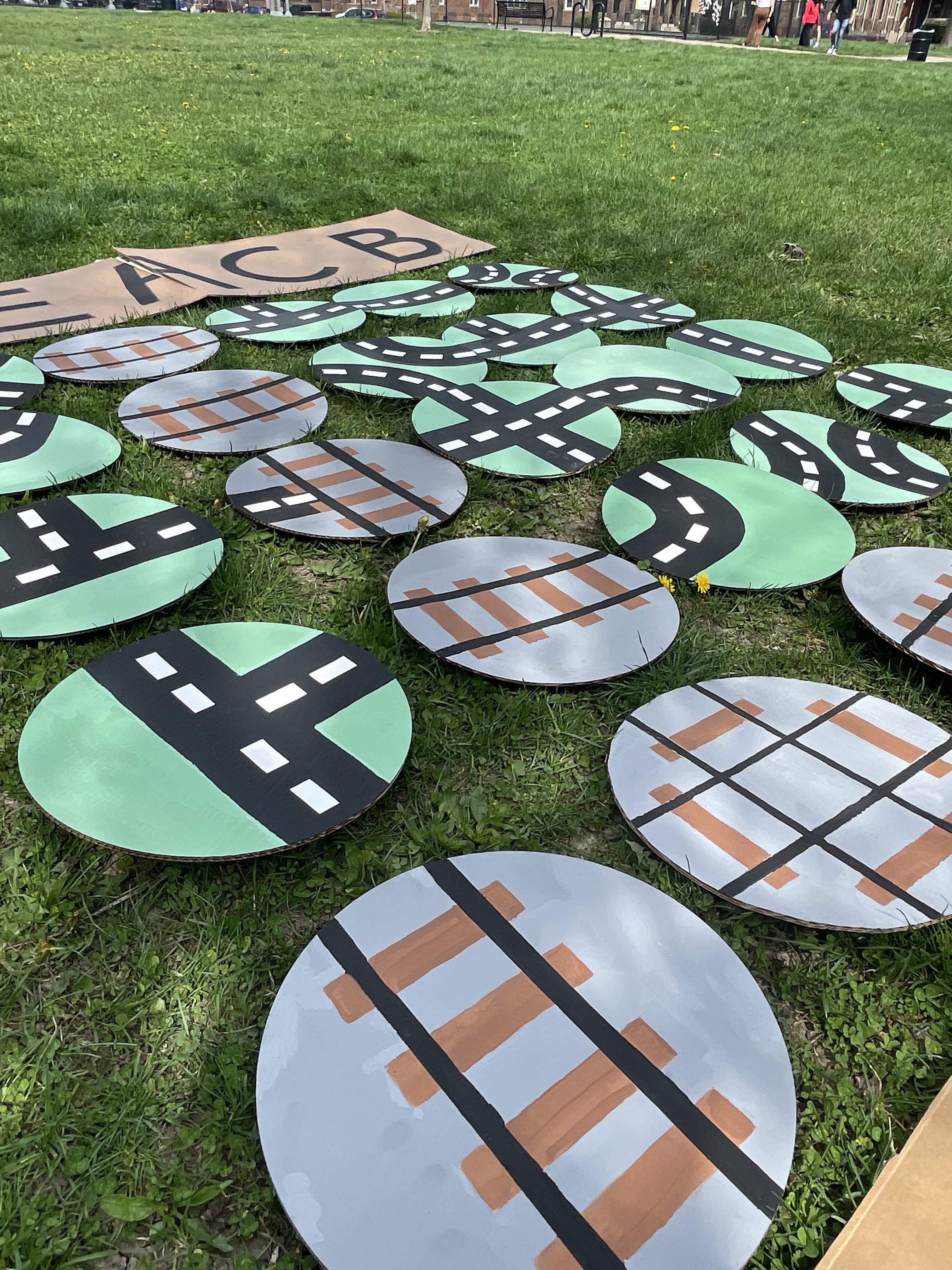 We achieved this by sizing it up to be something that could exist comfortably in a large outdoor space, and adding a modular concept to it that allowed the pieces of road to be turned to create new paths and areas across the map. These were then connected to our educational element by connecting trivia questions and answers relating to Columbus and the park area and its history. Below are photos of a small scale model, as well as a full scale prototype. For our large scale, we used letters as place holders for our questions since we didn't have them entirely solidified.